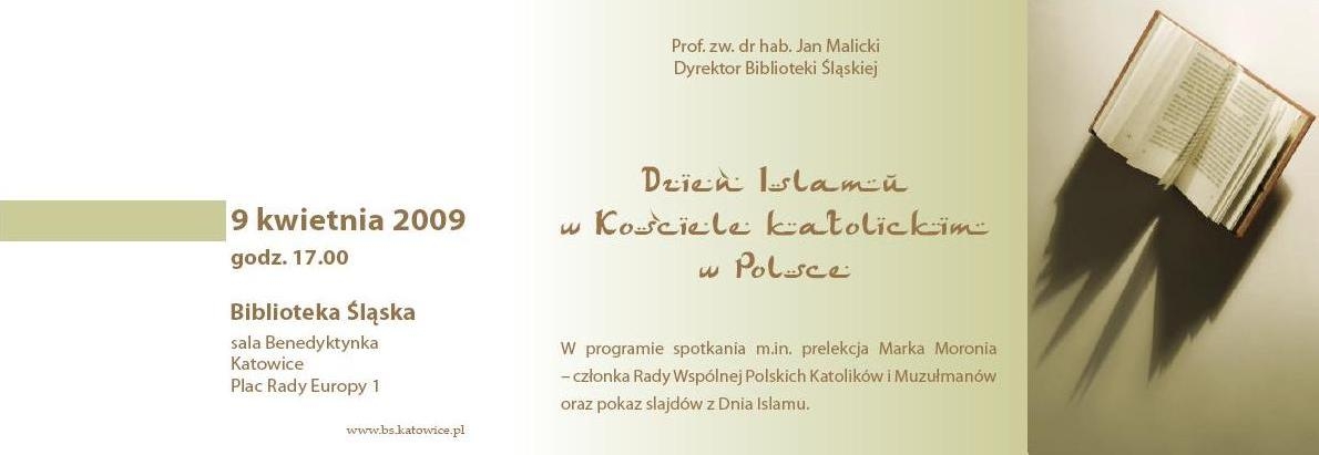 9.04.2009 o godz. 17.00 w Bibliotece Śląskiej w Katowicach odbędzie się prelekcja p. Marka Moronia, członka Rady Wspólnej Katolików i Muzułmanów